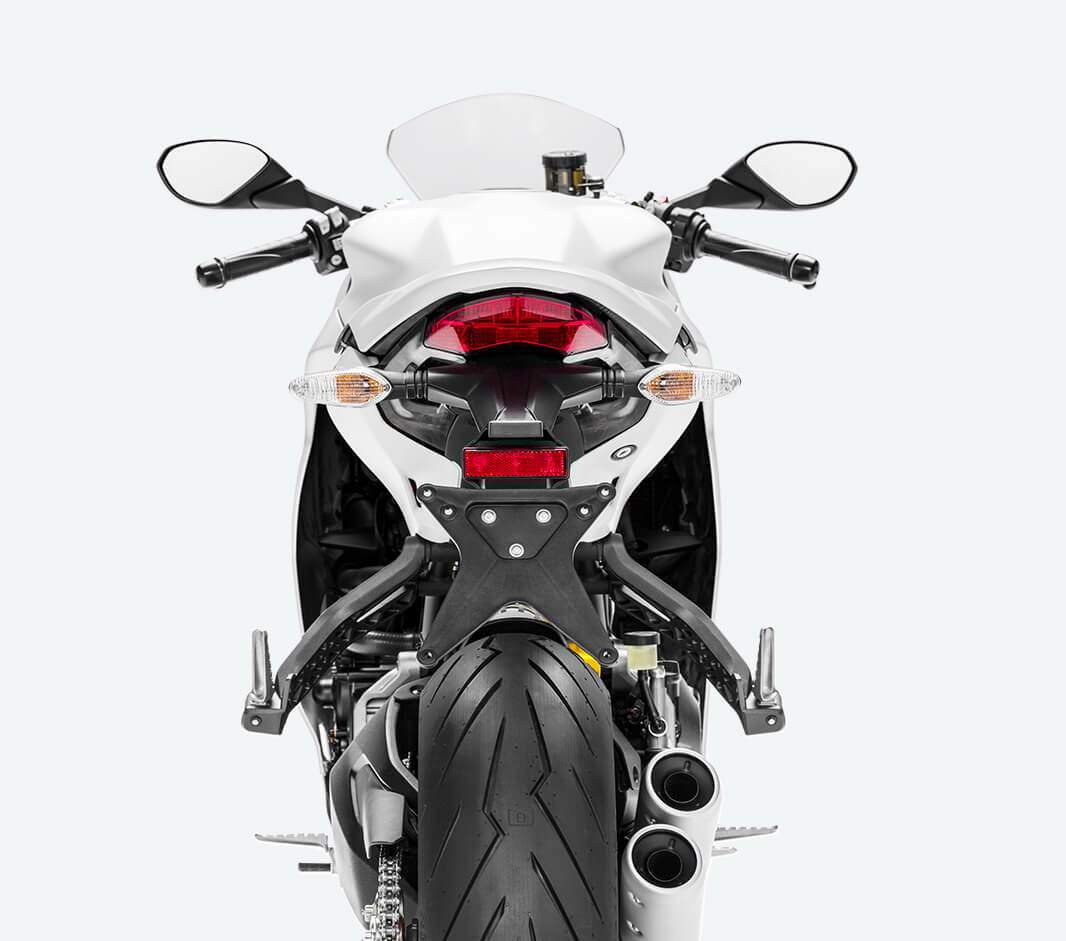 The innovative front fairing makes for an uninterrupted aerodynamic profile that draws the eye to the sculpted tank and the volume of the fairing, where the trellis frame is left on view. The tail piece, separate from the rest of the fairing, adds sports elegance and ensures maximum aerodynamic efficiency.